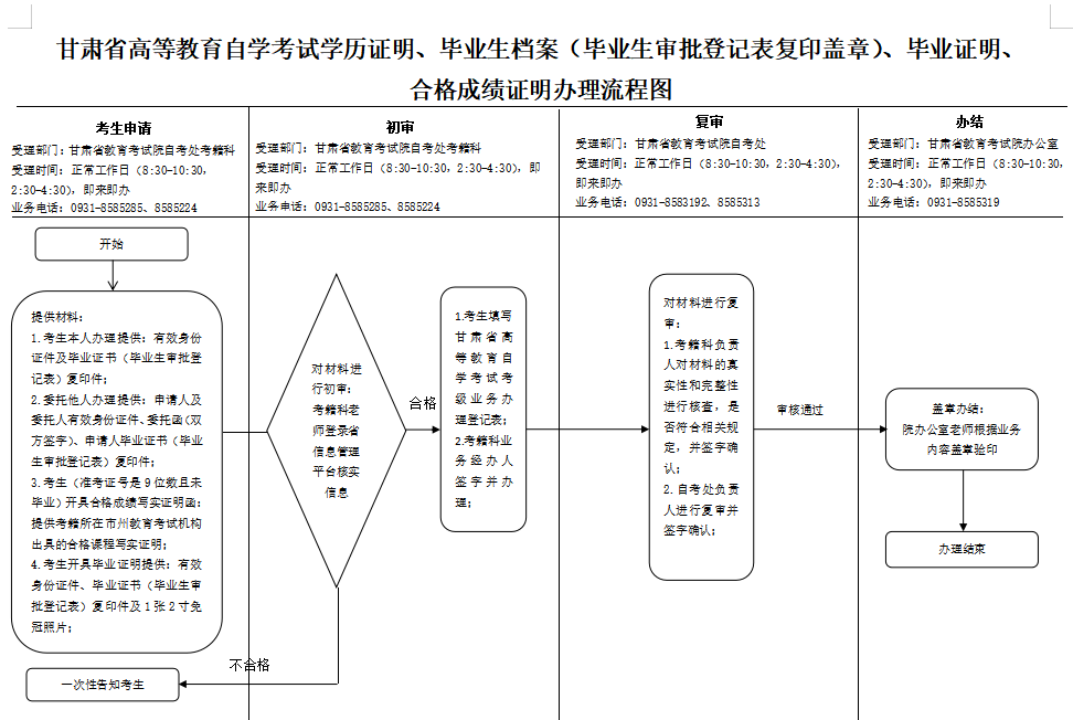 甘肃省高等教育自学考试学历证明、毕业生档案(毕业生审批登记表复印盖章)、毕业证明、 合格成绩证明办理流程图
